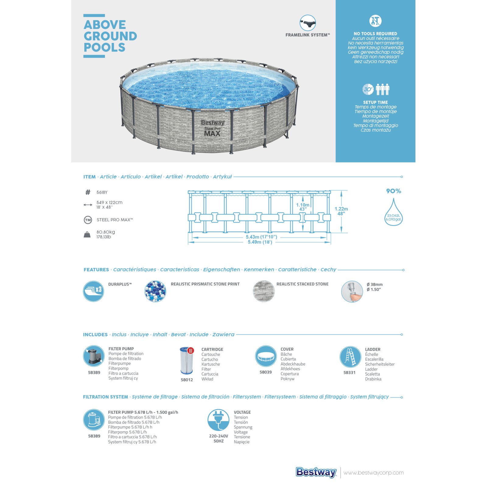 Svømmebassenget settes opp på 30 minutter uten bruk av verktøy. Alt klikkes sammen som en lek. Fyll opp badet med vann fra din hageslange, tilsett kjemikalier og la badet varmes opp av solen eller elektrisk varmer (kjøpes separat). Ditt Bestway badebasseng er klar til bruk!