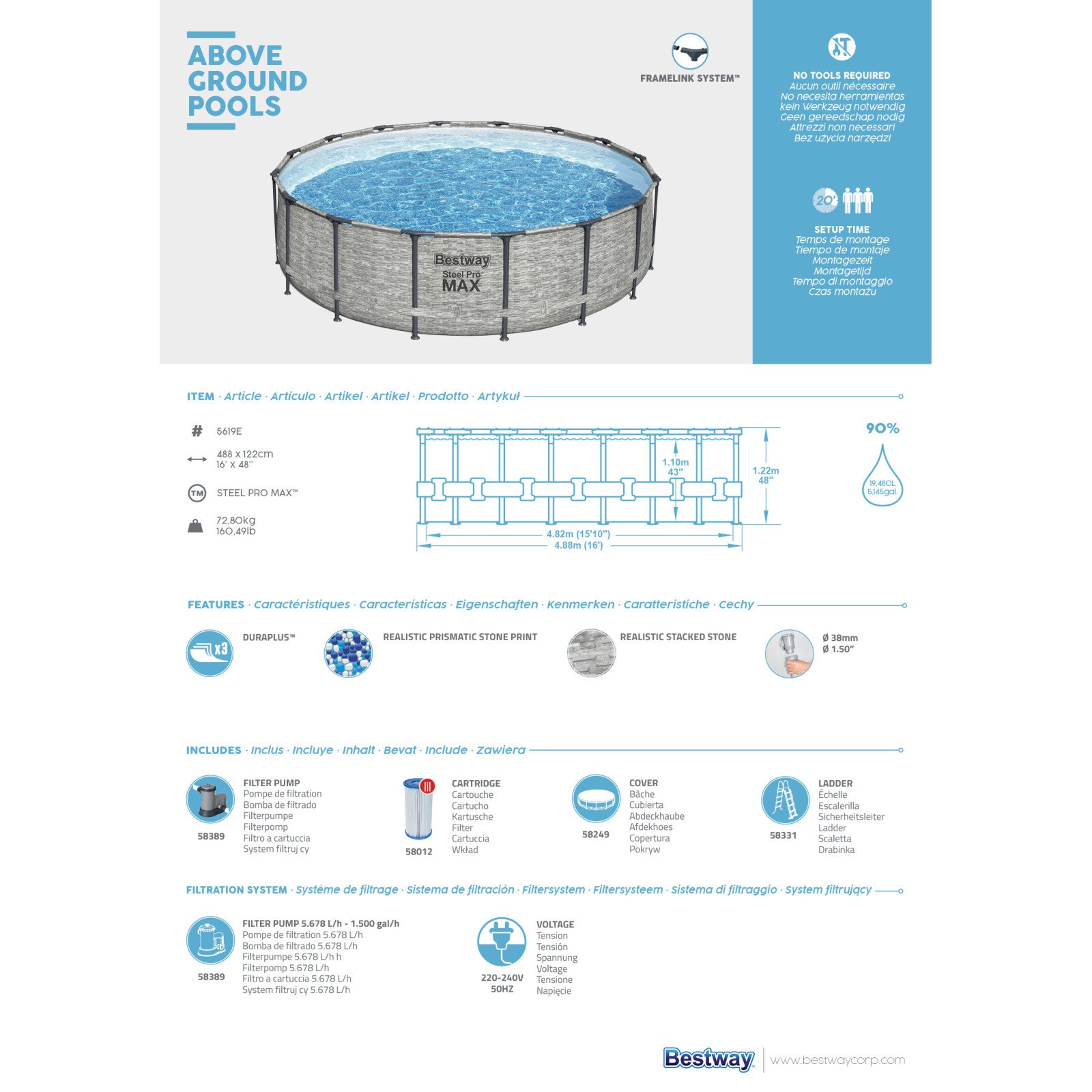 Bestway rammebasseng 488x122cm. 19480 liter.