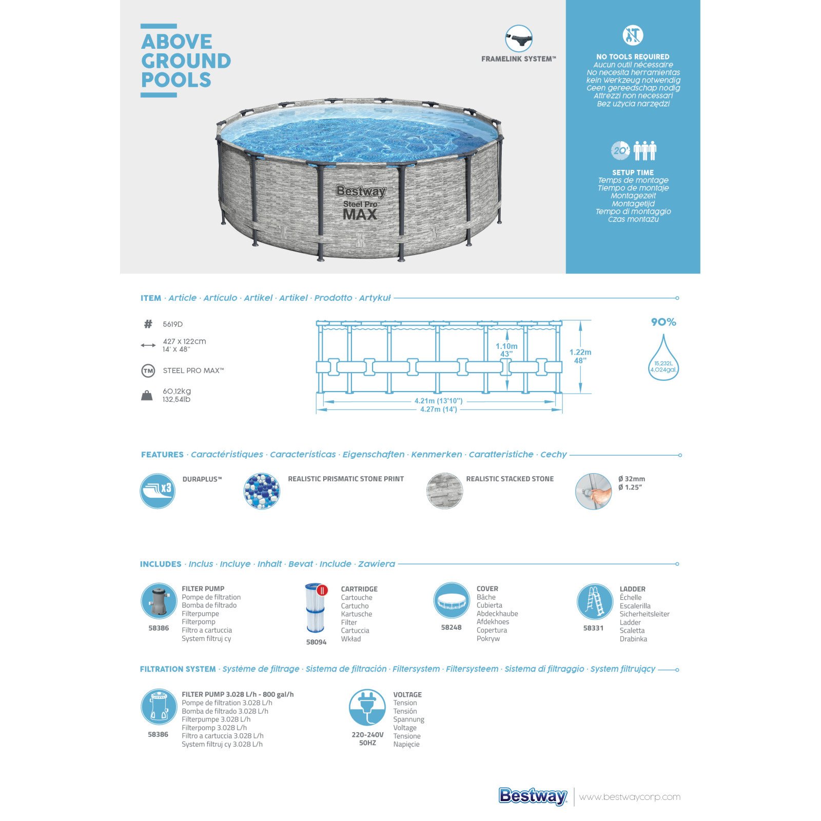 Bestway rammebasseng 427x122cm. 15232 liter.